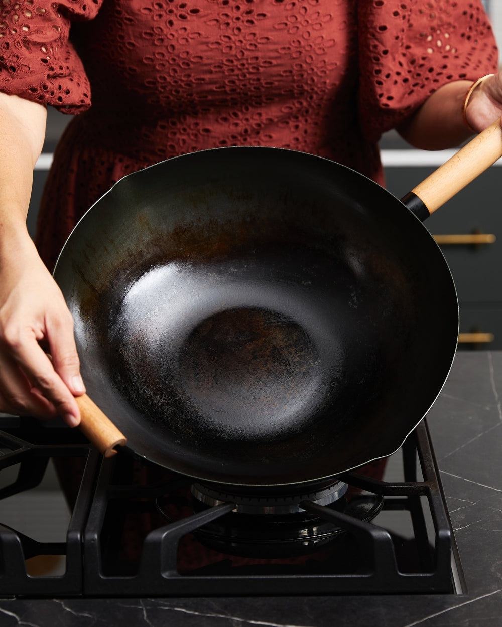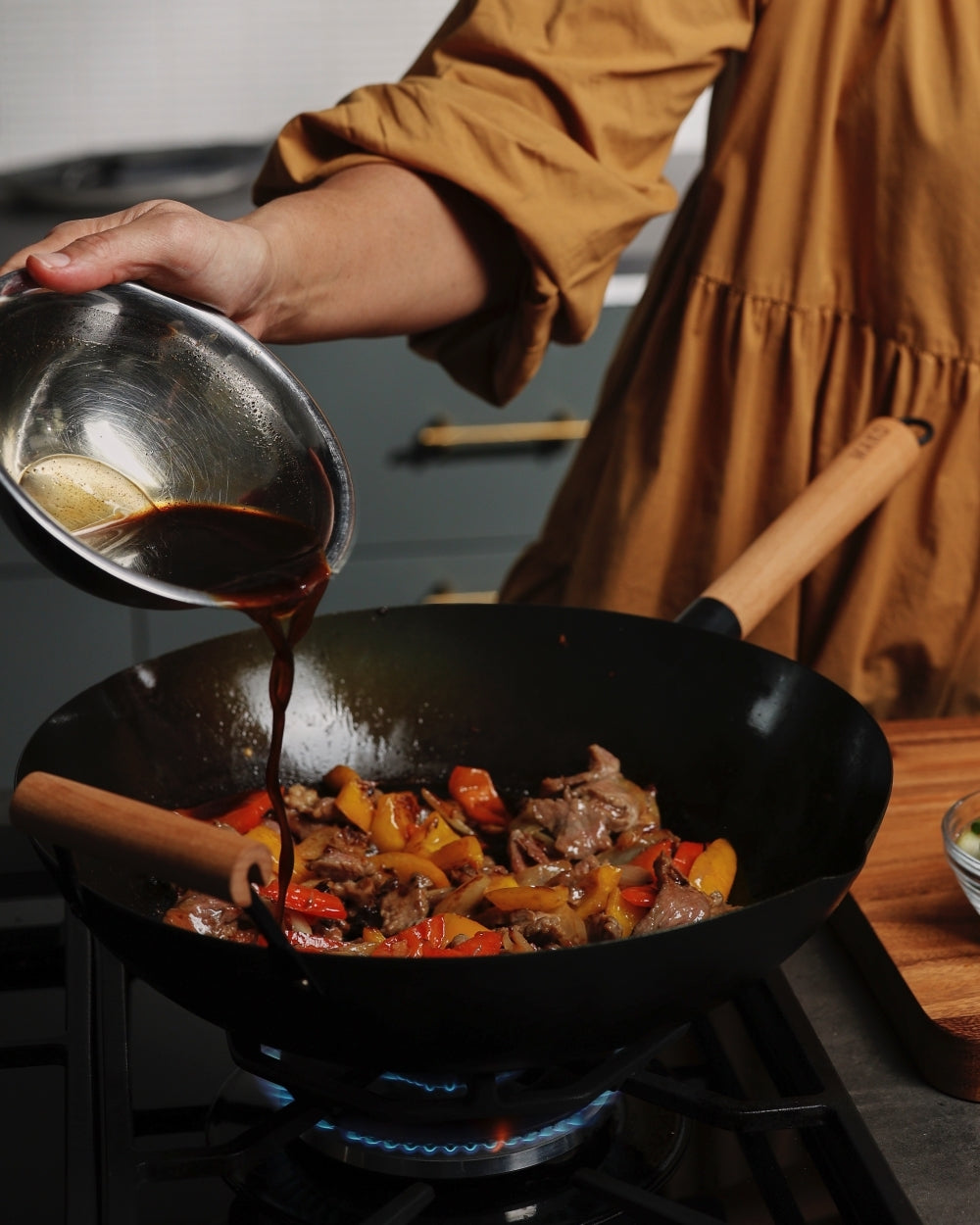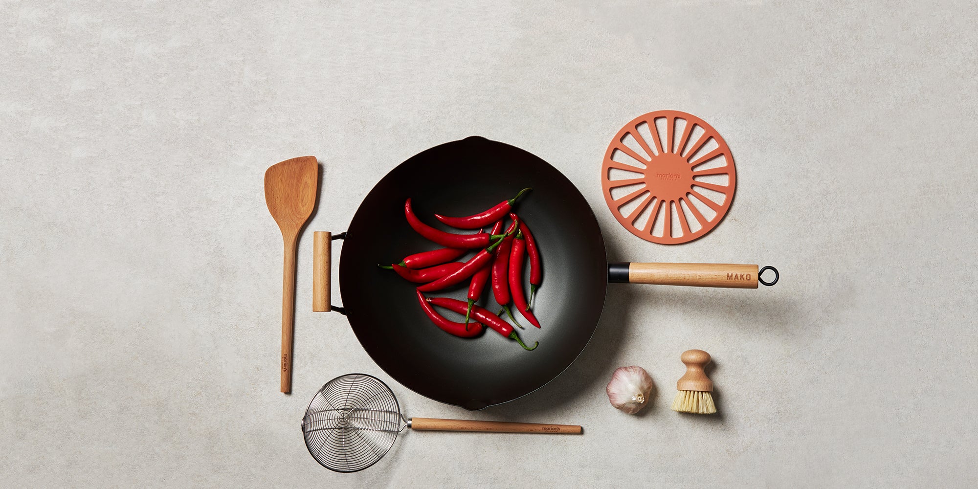 To speak to the MAKO Black Steel Wok specifically, its flattened base means its suited for any type of cooktop, including induction, and the heat-resistant wooden handles make it practical. So does the little pouring spout that makes saucing a breeze, come serving time.