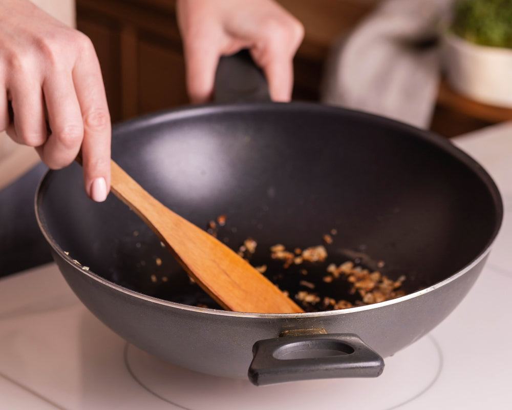 It’s not recommended you deep-fry in a non-stick wok either. The oil residue builds up over time and you can’t scrub it off. (You shouldn’t hard-scrub non-stick surfaces for any reason). Those made with an aluminium core are not suited for induction cooktops either.